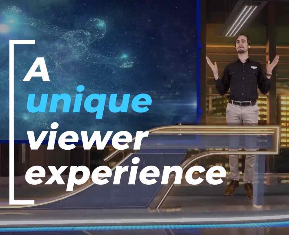 Build a custom virtual space featuring your company branding to elevate your viewers’ experience. Impress your viewers with a state-of-the-art real-time 3D Virtual Set.